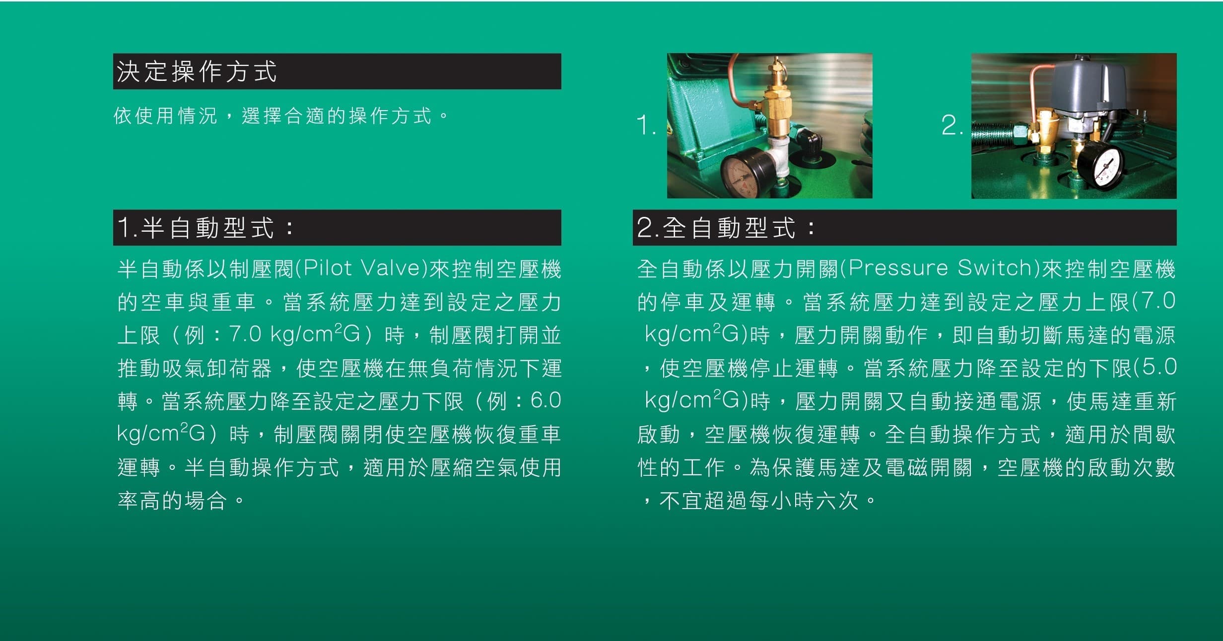 依所選擇的空壓機機型及使用環境配用所需的馬達。如單相110V或三相220V或380V 等。